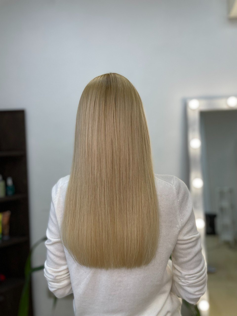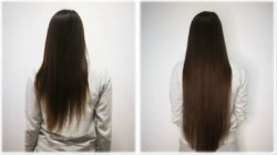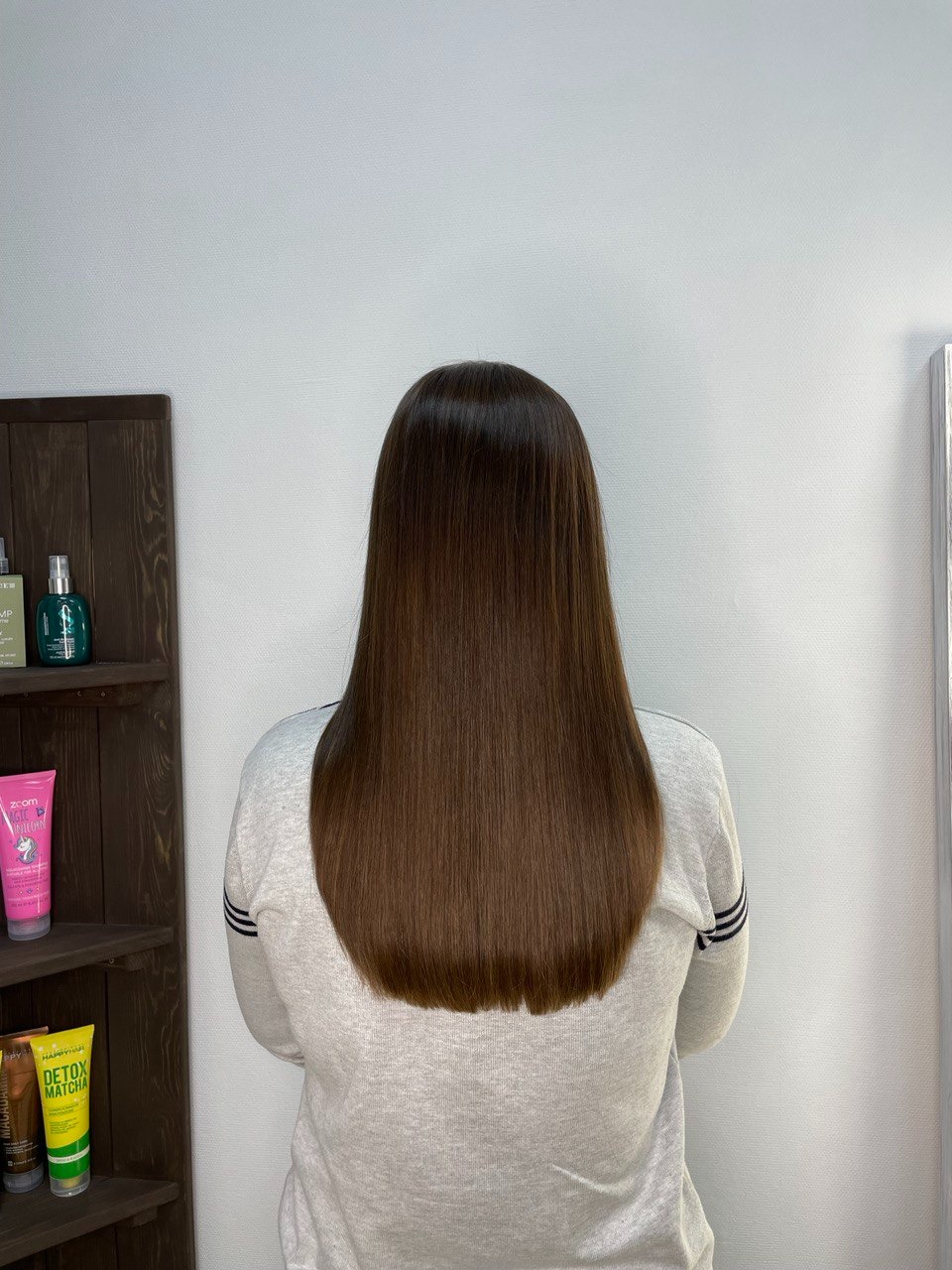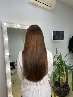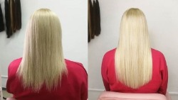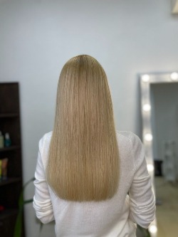 Такая красота создаётся кропотливо. Окрашивание донорских волос в омбре. Микс цвета в одну прядь, чтобы получился эффект мелирования. Реконструкция родных волос специальным составом (получили питание, увлажнение, разгладили структуру). Наращивание 200 прядей 60см